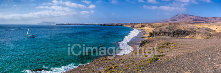 Papagayo view towards Playa Blanca Lanzarote. These natural sandy coves are a very popular location for local and visitors.